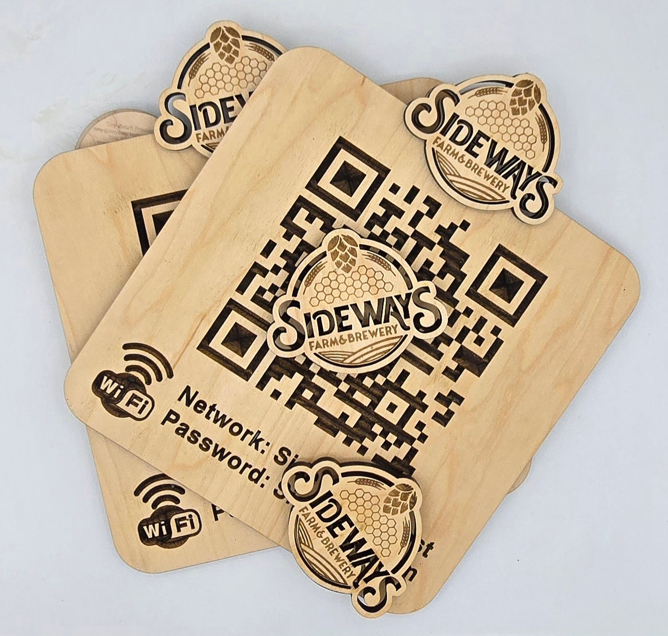 We offer a package consisting of two, eight inch QR code WiFi password signs and a dozen magnets of your design. With your WiFi user name and password, we create a QR code so your customers have to do nothing but point their camera at the sign to be logged into your WiFi, no more paper sign or customers asking how to spell your password.