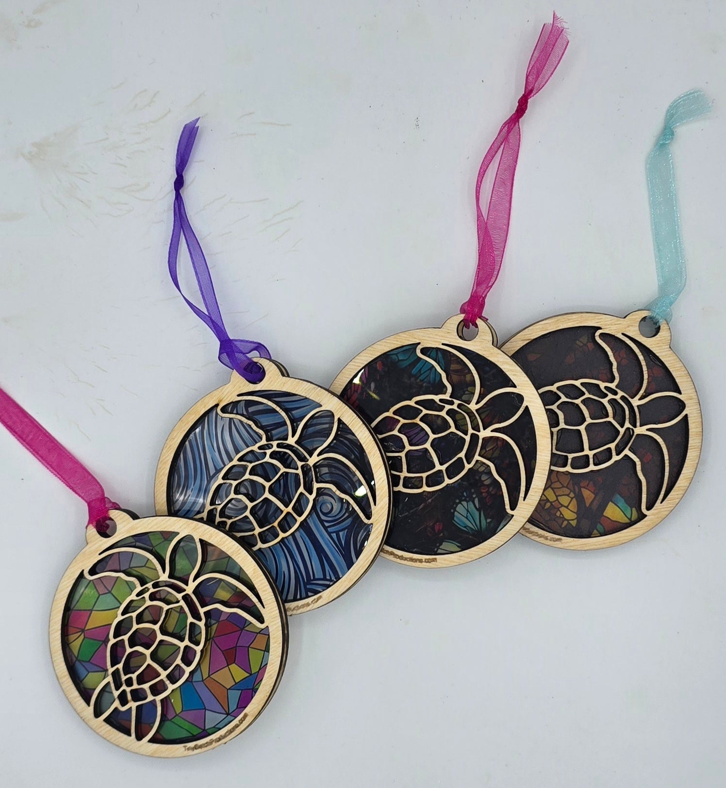 This handcrafted loggerhead turtle ornament combines natural wood with clear acrylic elements, capturing the distinctive features of these remarkable sea creatures. The layered construction creates dimensional depth, while the warm wood tones complement the transparent acrylic details. Perfect for marine enthusiasts, ocean conservationists, or anyone who appreciates wildlife-inspired décor. Ideal for holiday displays, year-round shelf styling, or as a meaningful gift for turtle lovers. A thoughtful piece that celebrates the beauty of nature's most iconic reptiles.
